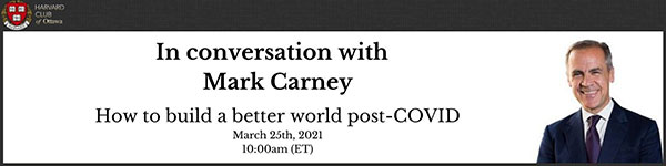Dr Mark Carney is UN Special Envoy for Climate Action and Finance and Prime Minister Johnson’s Finance Adviser for COP26. He was previously Governor of the Bank of England (from 2013 to 2020), and Governor of the Bank of Canada (from 2008 to 2013). Dr Carney has been nominated as a candidate for the Harvard Board of Overseers, with the elections taking place this April. His greatly anticipated book, Value(s) Building a Better World for All, is going to be published on March 16th 2021.